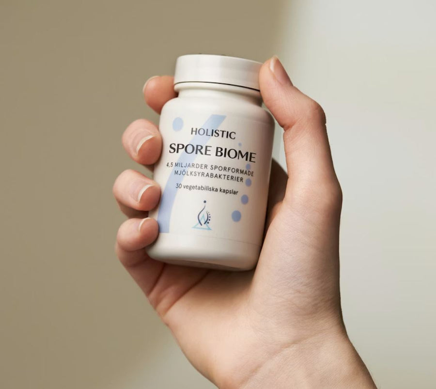 Holistic Spore Biome är en produkt som innehåller en bakteriesammansättningen för tarmfloran. Produkten innehåller minst 4,5 miljarder sporbildande bakterier från fyra noggrant utvalda och väldokumenterade stammar. Holistic Spore Biome innehåller även Livaux®, ett fruktpektinpulver från gul kiwi (Actinidia chinensis). Livaux® fungerar som näring för de goda bakterierna i tjocktarmen och gynnar särskilt de bakterier som producerar smörsyra – ett av de viktigaste näringsämnena för tarmslemhinnan. Detta skapar optimala förutsättningar för bakteriernas tillväxt och aktivitet.